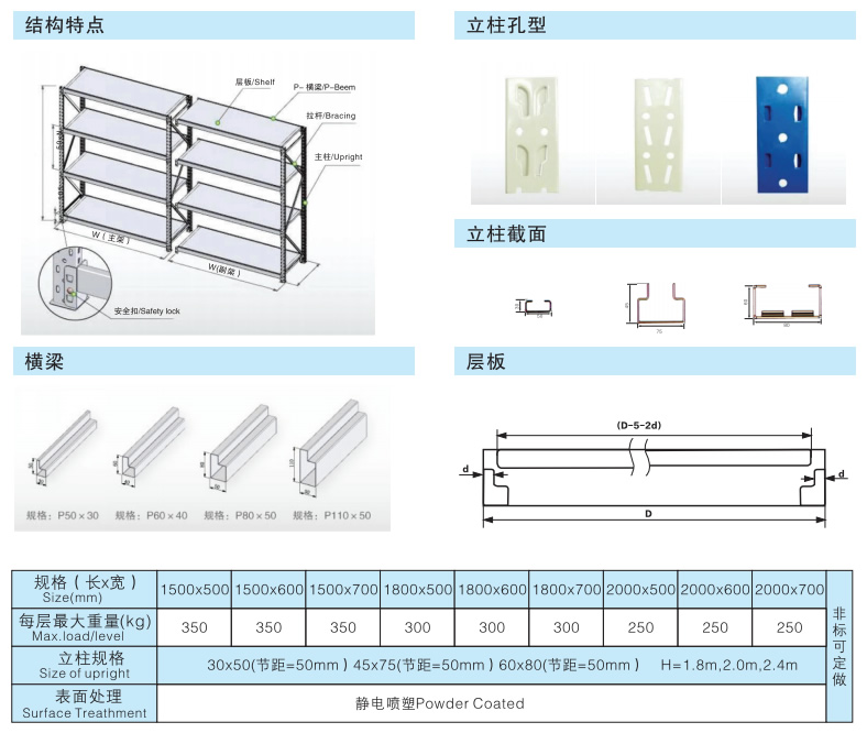 2、貨架橫梁采用“P”型管材,俗稱“階梯梁”,階梯的高度與層板的高度相匹配。