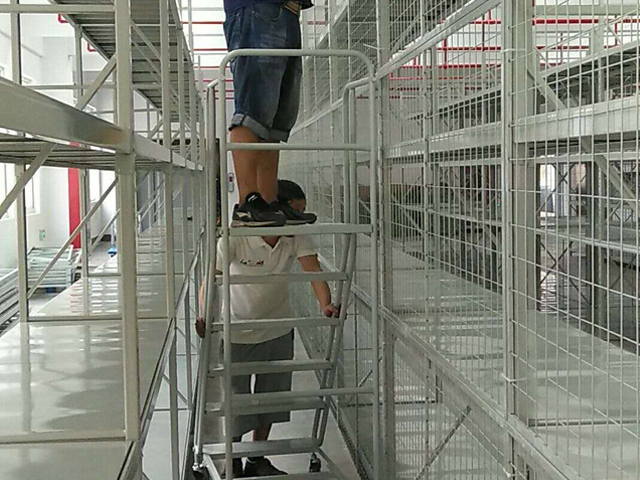 4、橫梁與立柱片掛接組裝成框架,最后鋪設(shè)鋼層板,至此一組完整的中型貨架成型。